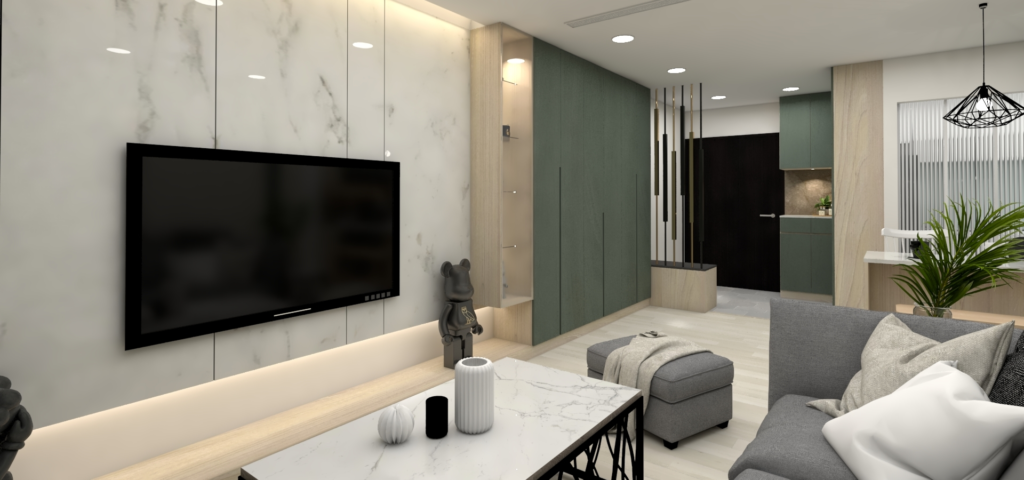 當平面配置確認後,正式進入 3D 渲染階段。設計師會透過建模、材質貼附與燈光設定,將設計概念轉化為可視化的空間畫面,協助業主清楚理解:空間比例與尺度感、材質實際呈現效果與燈光氛圍與整體風格。